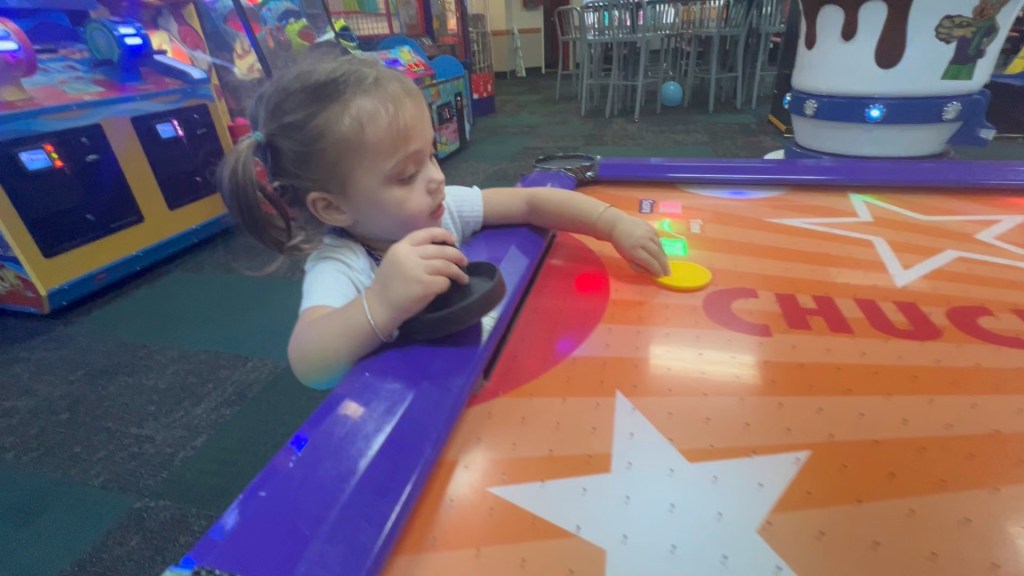 Here you are playing air hockey. You didn’t even need anyone to show you how to play! You were a natural. But of course, you know me, I always want to teach you something (even if you already know it…)