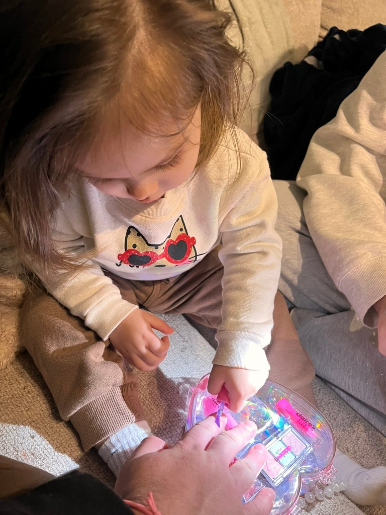 This is a photo of you and your first make-up kit. You were so excited to try it out! It had eye shadow, lip gloss, and nail polish. You just couldn’t wait to go home and open up the heart shaped make-up box and get to work.