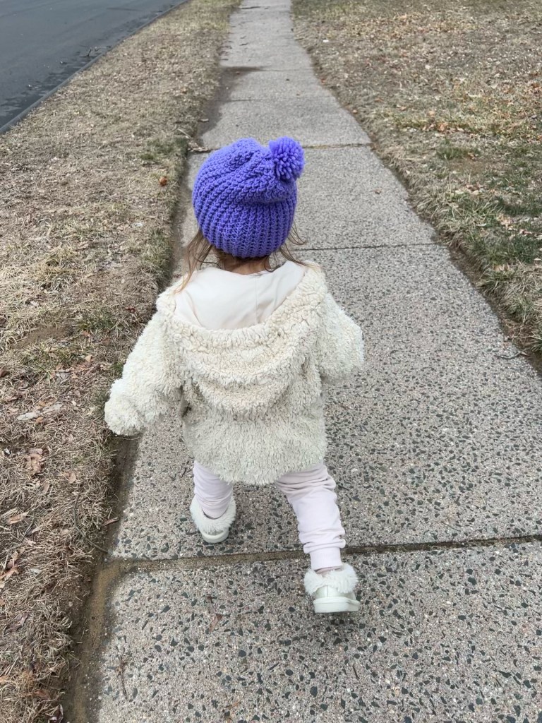 Our walk was around the whole circle. Your hood kept falling off but you put it back on all by yourself! We saw some bugs, some people and cars, some sticks…